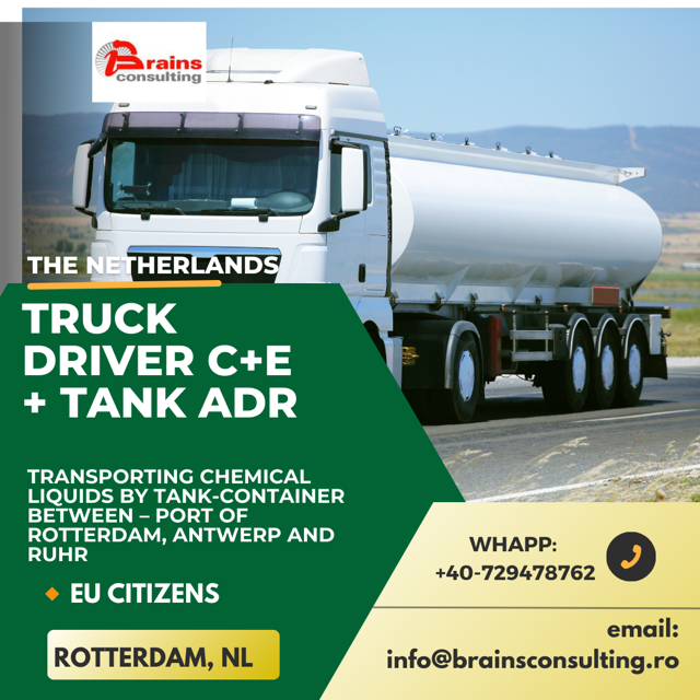 For our Dutch client near Rotterdam we are looking for International CE Truck Drivers with tank-container ADR experience (CHEMICAL Liquids). This company is transporting all kinds of goods with tank containers, mainly between the ports of Rotterdam (Holland), Antwerp (Belgium) and Ruhr region (Germany). A candidate must have experience with those places and experience with a tank container.