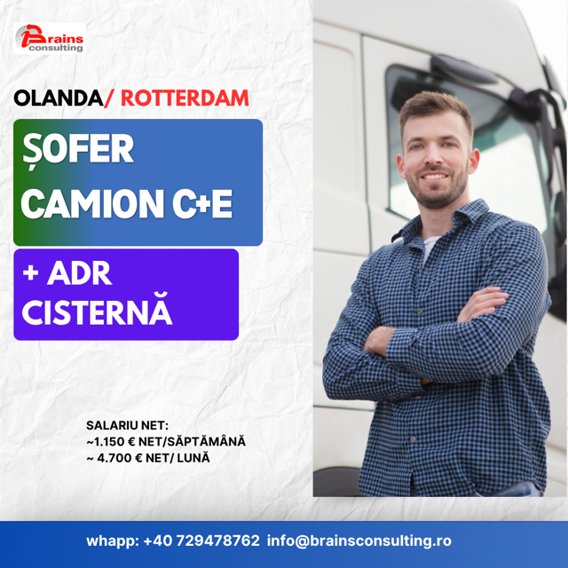 Pentru clientul nostru din Olanda (lângă Rotterdam) căutăm șoferi C+E internaționali cu experiență ADR cisternă (lichide chimice).
